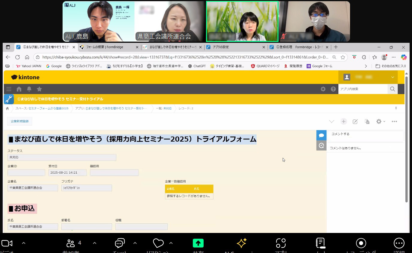 伴走支援では、申込内容や既存アプリの構成をもとに、画面を共有しながら現状を丁寧に確認してもらいました。業務のどこで手戻りが起きているのか、